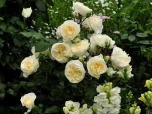Кремовые, с оттенками нежно-желтого, квартированные, средне-махровые (около 25 лепестков) цветки появляются в небольших соцветиях на компактном кусте со светло-зеленой листвой. Сорт может использоваться для контейнерной посадки.