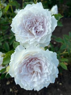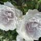 Роза с белыми махровыми цветами, в полуроспуске лавандовые с пепельным оттенком по волнистому краю и сладким ароматом, 7-8 см. Куст с тонкими полу-прямыми ветвями высотой около метра. Рост слабый, не любит сильную образку.