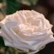 Современная срезочная роза. Крупный цветок белой окраски с оттенком слоновой кости. Форма цветка изысканная, сочетает в себе классический бокал с квартированным центром. Внешние лепестки изогнуты "уголком". Центр цветка слегка розовеет.